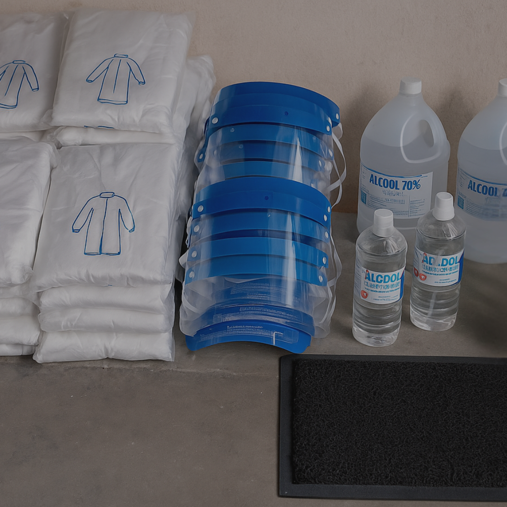BotãoÁlcool gel, álcool 70%, face shield, capotes, tapetes sanitizantes, termômetro digital.